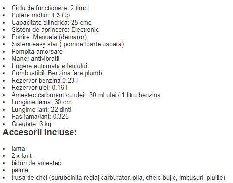 Motoferastraul este dotat cu un motor in 2 timpi de 1.3 cp , pornirea fiind efectuata la demaror.
