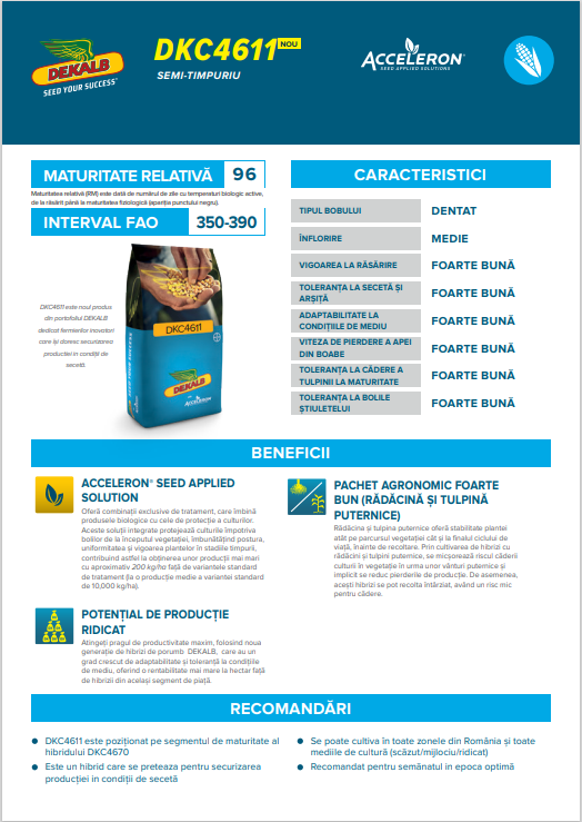 DKC 4611 – este un hibrid semi-timpuriu FAO 350, cu un start de excepție în primăvară, care face parte din noua generație de hibrizi Dekalb, sub conceptul Field Shield, cu o toleranță remarcabilă la secetă și arșiță, cu o adaptabilitate extraordinară la diferite tehnologii, iar viteza de pierdere a apei este una excelentă.