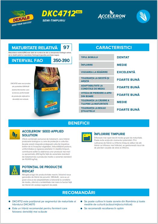 Seminte porumb Dekalb DKC 4712 - este noul produs din portofoliul DEKALB dedicat fermierilor care își doresc performanță de producție obținută la densități mai scăzute.